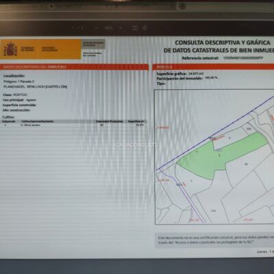 En venta, en la Partida Planchadel, un terreno de 24,900 metros cuadrados ubicado a solo 4 kilómetros de Benlloch. De este total de terreno, aproximadamente 16,000 metros cuadrados están dedicados al cultivo de almendros y 8,000 metros cuadrados al cultivo de olivos.